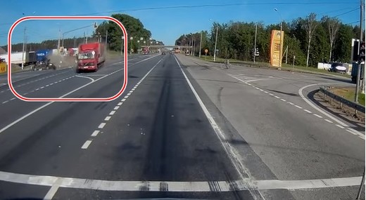 Kravas auto brutāli taranē vieglo automobili, kas apstājas pie sarkanā signāla. Mirkli pirms trieciena vieglā auto šoferis mēģina glābties, taču tad bija jāstartē daudz straujāk (visi notikumi no 1,30 līdz 1,40 min).