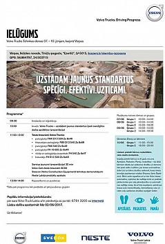 Lai izmēģinātu testa braucienos Volvo kravas automašīnas, kas vēl tikai pērn tika prezentētas izstāde Gēteborgā, Zviedrijā, ielūdzam Jūs uz "Volvo Trucks Tehnikas dienām 7.-10.jūnijā", karjerā Vārpas, Ikšķiles novadā, Tīnūžu pagastā, "Ezerlīcīši".