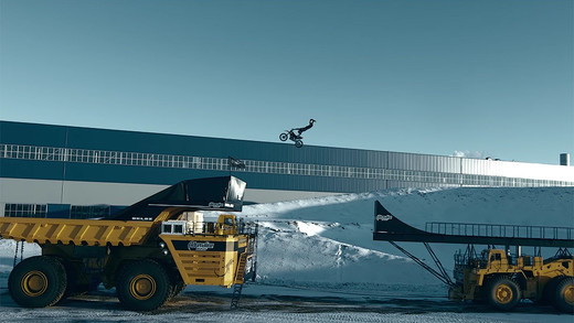 Krievu motofrīstaila (FMX) pārstāvis Vladimirs Jarigins veicis kaskadiera cienīgu triku, pārlecot ar savu motociklu no viena braucoša "BelAZ" kravas auto uz otru.