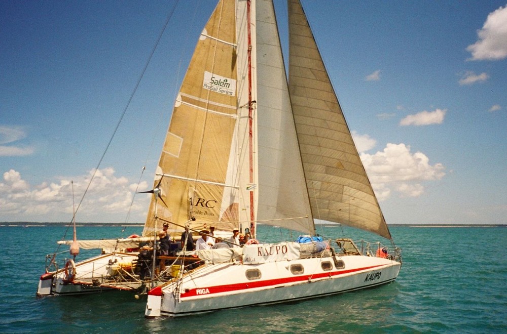 1977. gadā Latvijā būvētais, 13,3 metrus garais katamarāns "Kaupo" savu pirmo un Latvijas burāšanas vēsturē pirmo pasaules apceļojumu sāka 1999. gada 31. oktobrī. Ceļojumā devās kapteinis Valdis Grenenbergs-Grīnbergs, kapteinis Aleksandrs Popovs, matroži Jurijs Petrovs, Igors Pimenovs, Staņislavs Marcenjuks, kā arī koks Svetlana Timofejeva. Komanda pirmajam pasaules apceļojumam bija izvēlējusies virzienu – no austrumiem uz rietumiem, maršrutā iekļaujot Laspalmas, Buenosairesu, Horna ragu, Valparaiso, Losandželosu, Darvinu, Labās Cerības ragu un Azoru salas. Šis maršruts pasaules apceļotāju starpā tiek uzskatīts par ļoti grūtu, jo Horna raga apņemšana, kas nekad nav bijis vienkāršs uzdevums, ir jāveic pret valdošo vēja virzienu.