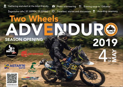 Sestdien, 4.maijā, posmā Cēsis-Rīga jau ceturto reizi norisināsies pasākums ielas enduro motocikliem - TwoWheels AdvEnduro 2019, ko organizē Moto piedzīvojumu klubs apPasaule