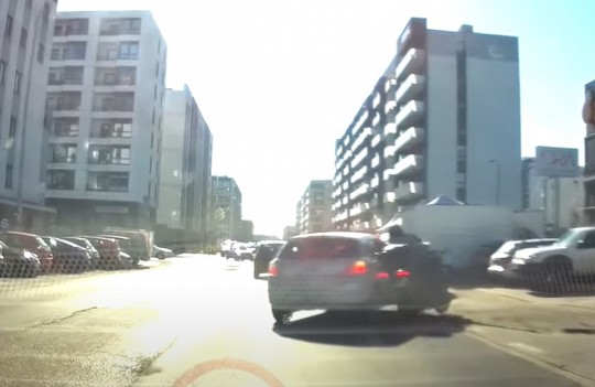 Motorollera vadītājs apsteidz pa labo pusi un saduras ar automašīnu, kas vēlas iebraukt stāvvietā. Video autors vaicā, kurš vainojams sadursmē?