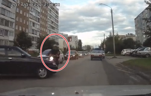 Ievērojot rāvējslēdzēja principu, baltās automašīnas šoferis uzmirkšķina sānielā gaidošajam automobilim, ka ļauj tam izbraukt uz galvenās ielas. Pēdējais to arī dara, taču nākamajā mirklī saduras ar motociklu, kas lielā ātrumā apdzen visu rindu. Labā ziņā - video ievietotājs apgalvo, ka motocikla vadītājs nav stipri cietis.