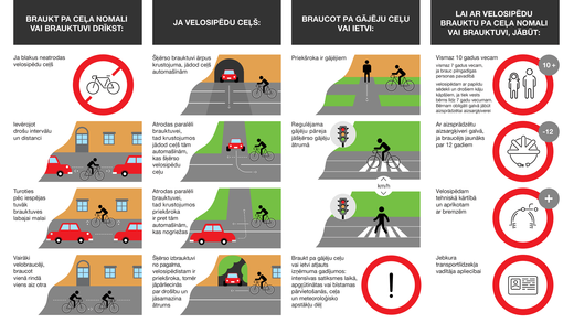 Valsts policija vērš uzmanību, ka gan riteņbraucējam, gan autovadītājam ir jāievēro drošs intervāls un distance vienam no otra. Velosipēdistam ir jāpārvietojas pēc iespējas tuvāk brauktuves labajai malai un, ja satiksmē pārvietojas vairāki riteņbraucēji, tad tiem ir jābrauc vienam aiz otra, nevis blakus. Velosipēdistam ir jāatceras, ka braucot pa gājēju ceļu vai ietvi, priekšroka ir gājējam. Piedaloties satiksmē ar velosipēdu, nedrīkst aizmirst par pareizi aprīkotu velosipēdu ar gaismu atstarojošiem elementiem un ķiveri savai drošībai!