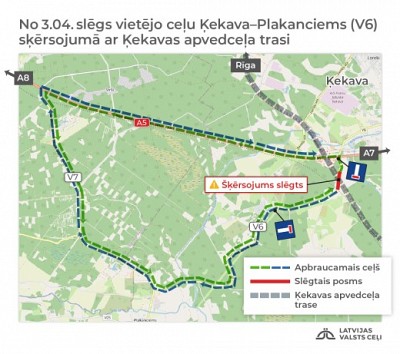 Turpinot Ķekavas apvedceļa būvdarbus, šā gada 3. aprīlī plānots satiksmei slēgt vietējā autoceļa Ķekava–Plakanciems (V6) posmu, kas šķērso topošā Ķekavas apvedceļa trasi.