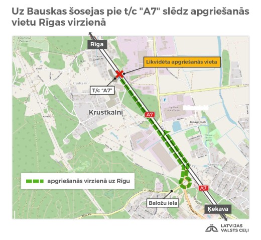 No otrdienas, 6. augusta, uz Bauskas šosejas (A7) pie tirdzniecības centra A7 (7,78. km) tiks slēgta apgriešanās vieta virzienā uz Rīgu. Turpmāk apgriešanās braukšanai Rīgas virzienā būs caur jaunizbūvēto Ķekavas ielas apļveida krustojumu ar Baložu ielu (skat. kartē).