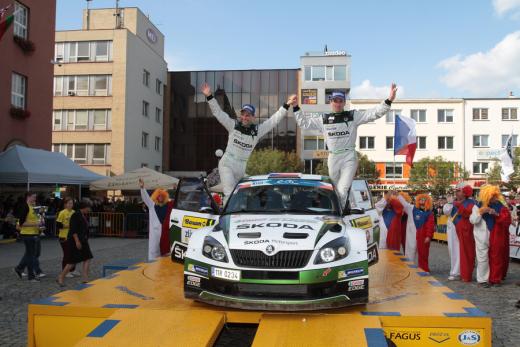 Jans Kopeckis ar stūrmani Pāvelu Dresleru pēc uzvaras Čehijas rallijā Foto: fia.com
