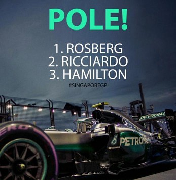 Rosbergs, kurš sestdien bija labākais arī trešajā brīvajā treniņbraucienā, kvalifikācijā apli veica minūtē un 42,584 sekundēs, kamēr otro labāko apļa laiku uzrādīja austrālietis Daniels Rikjardo no "Red Bull", kurš bija par nepilnām sešām sekundes desmitdaļām lēnāks.