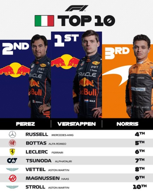 Otrais bija viņa komandas biedrs Serhio Peress, trešais finišēja "McLaren" braucējs Lendo Noriss, bet Verstapena sīvākais konkurents Šarls Leklērs "Ferrari" mājas sacīkstē desmit apļus pirms finiša zaudēja vietu uz goda pjedestāla, palikdams sestajā pozīcijā.