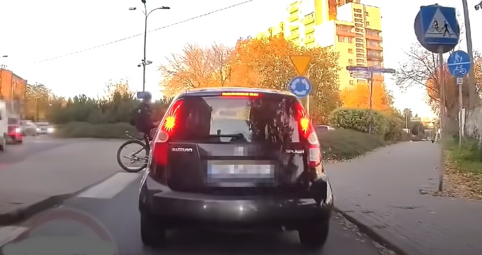 Velosipēdists sadusmojas par to, ka autovadītājs pirms pārejas bremzē tik vēlu, ka abi transportlīdzekļi gandrīz vai saskaras.