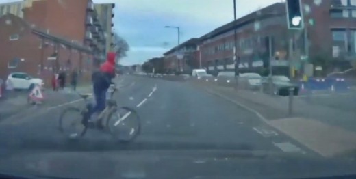 Autovadītājs brauc pie zaļās gaismas un saduras ar velosipēdistu, kurš izbrauc no aizsega (var no 0:20)