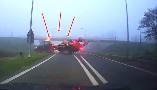 Video nofilmēta iespaidīga avārija Nīderlandē - aizķeroties uz platformas vedamā ekskavatora strēlei aiz tilta balsta, līdzsvaru zaudē arī šo tehniku velkošais traktors, kā rezultātā apgāžas viss sastāvs.
