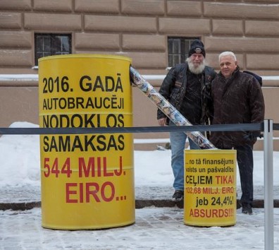 Uz lielās mucas bija lasāms atgādinājums, ka 2016. gadā autobraucēji nodokļos valstij samaksās 544 miljonus eiro. Savukārt uzraksts uz mazās mucas vēstīja, ka no šīs naudas līdzvalsts un pašvaldībuceļiem nonāks tikai 132,68 miljoni eirovai 24,4%!