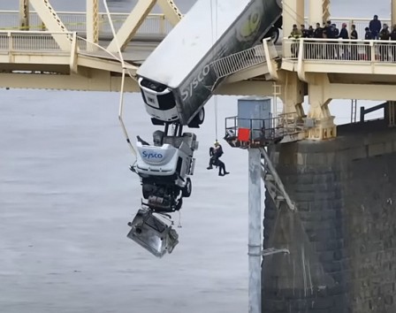 Laimīgā kārtā vilcējs ar puspiekabi iesprūda metāla konstrukcijās un lai gan tas varēja jebkurā brīdī izkustēties no vietas, glābēji paguva ierasties laikā un sarežģītas operācijas gaitā izglāba vispirms vadītāju, tad uzvilka atpakaļ uz tilta arī viņas kravinieku.