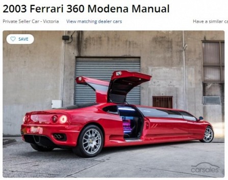 Austrālijā pārdod limuzīnu uz Ferrari 360 Modena bāzes. Pārdevējs prasa par to 400 000 dolāru.