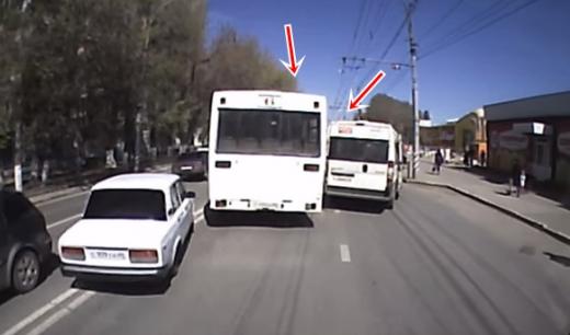 Autobuss nespēj vai negrib apbraukt mikroautobusu, kas apstājies pārkāpjot noteikumus.
