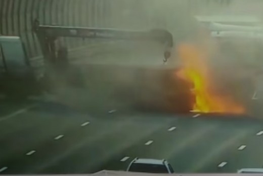 Gandrīz uzreiz tam aizmugurē ieskrien vieglā automašīna, taču ļaunākais seko pēc tam - neliels kravas furgons piepeši šķērso divas joslas, aizsedzot skatu lielākajam furgonam, kas, iespējams tieši tādēļ avārijas vietu ierauga pēdējā mirklī. Notiek vēl viena sadursme un izceļas ugunsgrēks.