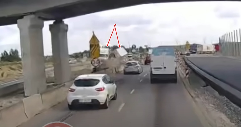 Video redzams, ka pretējā joslā avarē kravas auto. Avārija izskatās netipiska, jo vispirms gāžas puspiekabe, kas novelk sev līdzi arī vilcēju.