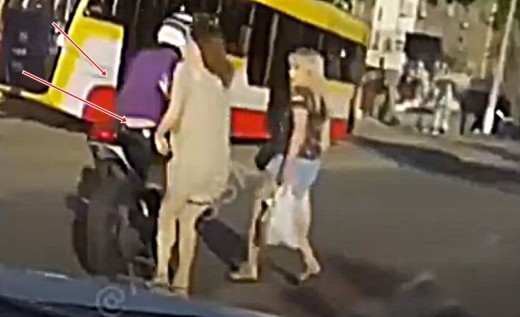 Motociklistu, kurš tik tikko nenotriec sievietes uz gājēju pārejas, jau pēc dažām sekundēm aiztur policija.