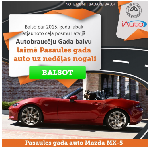 Nobalsojušie autovadītāji varēs laimēt nedēļas nogali ar jauno Pasaules Gada auto 2016 Mazda MX-5 kabrioletu no portāla iAuto.lv, kā arī saņemt citas balvas! Balsošana noslēgsies 6. maijā, aicinām autovadītājus būt aktīviem un izmantot iespēju nobalsot!