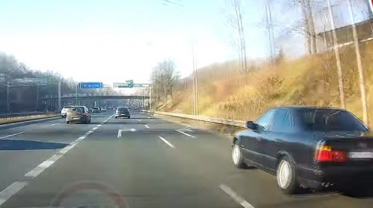 Neraugoties uz briesmām citiem satiksmes dalībniekiem, autovadītājs veic ļoti bīstamu manevru, lai nokļūtu atpakaļ uz automaģistrāles.