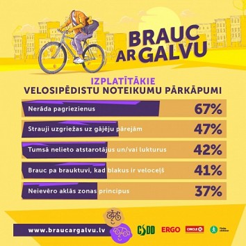Velosipēdisti kā savus biežāk pieļautos noteikumu pārkāpumus norāda pagrieziena nerādīšanu (67 %), strauju uzgriešanos uz gājēju pārejām (47 %), lukturu vai atstarotāju nelietošanu tumsā (42 %), braukšanu pa brauktuvi vietās, kur blakus ir velojoslas vai veloceļš (41 %), kā arī aklās zonas principu neievērošanu (37 %).