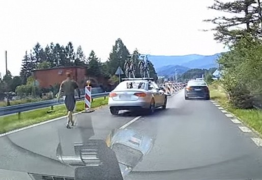 Vietā, kur ceļš sašaurinās līdz vienai joslai, BMW vadītājs nolemj paregulēt satiksmi, taču citi autovadītāji viņa nodomu nesaprot.