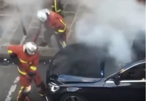 Video iemūžināts Parīzes ugunsdzēsēju darbs, dzēšot kādu sākumā šķietami neliela uguns perēkļa pārņemtu Mercedes.
