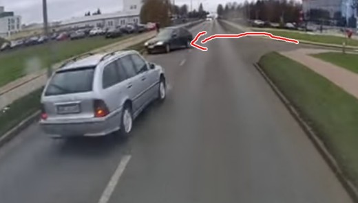 Mercedes vadītājs apdzen brīdī, kad no blakus teritorijas izgriežas cits transportlīdzeklis un nonāk tajā pašā braukšanas joslā.