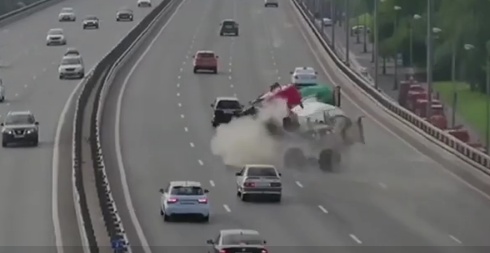Cementvedēja šoferis pārkārtojas pārāk strauji, smagsvars sāk gāzties un aizķer atkritumu savākšanas auto, apgāžot arī to.