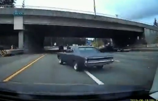 Klasiskais 70.gadu Chevrolet Chevelle noripo no treilera, šķērso visas joslas un nonāk priekšā video autoram, kurš nepaspēj nobremzēt.