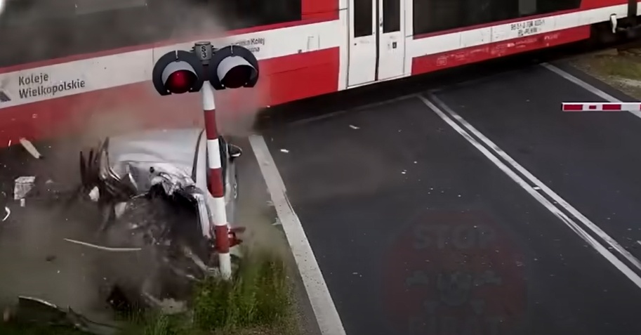 Par vēlu bremzējot, vadītājs apstājas tieši dzelzceļa pārbrauktuves vidū, taču izdara neko, lai izvairītos no sadursmes.