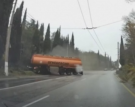 Degvielas vedēja šoferis neizvēlas pareizo braukšanas ātrumu un zaudē kontroli pār savu spēkratu. Šoreiz viss beidzas laimīgi, jo pārējie satiksmes dalībnieki ir drošā attālumā, bet cisterna apstājas dažus metrus no staba.