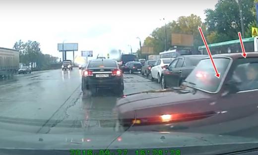 Video autors vaicā, kurš vainīgs pie notikušās sadursmes un skaidro, ka, cenšoties izvairīties no satiksmes sastrēguma, žigulis brauc pāri četrām joslām, bet kravas Gazel brauc pa piekto joslu. Ceļa joslas pie tam nav iezīmētas.