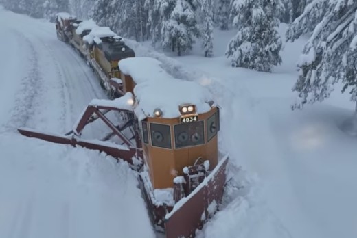 Drons pavada dzelzceļa sliežu sniega tīrītāju ASV, Kalifornijas štatā.