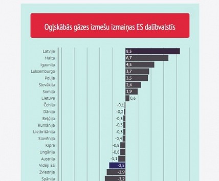 Saskaņā ar tiem mūsu valstī enerģijas patēriņa izraisītais ogļskābās gāzes izmešu apmērs pērn salīdzinājumā ar 2017.gadu palielinājās par 8,5%. Vēl kāpums fiksēts Maltā (+6,7%), Igaunijā (+4,5%), Luksemburgā (+3,7%), Polijā (+3,5%), Slovākijā (+2,4%), Somijā (+1,9%) un Lietuvā (+0,6%).