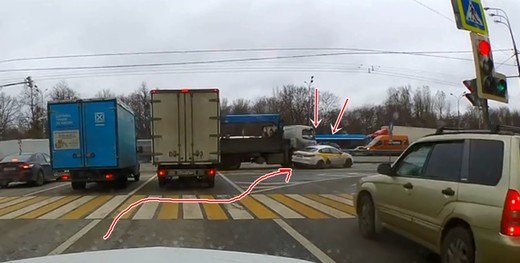 Taksists izdomā kā tikt visiem garām, taču jau nākamajā brīdī izraisa sadursmi ar kravas auto.