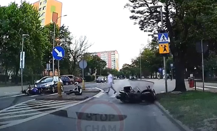Gājējs "nogāž" divus motociklistus (+ VIDEO)