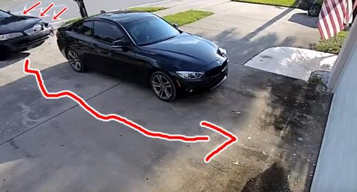 Video novērošanas kameras fiksē Gymkhana cienīgu triku - nevadāma "Toyota" sānslīdē brīnumainā kārtā tikai dažu milimetru atstatumā paslīd garām "BMW" un izgāžot vārtus, noparkojas svešā garāžā.