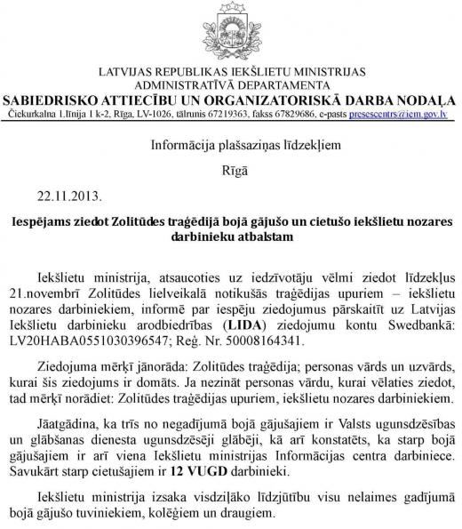 Iekšlietu ministrija, atsaucoties uz iedzīvotāju vēlmi ziedot līdzekļus 21.novembrī Zolitūdes lielveikalā notikušās traģēdijas upuriem – iekšlietu nozares darbiniekiem, informē par iespēju ziedojumus pārskaitīt uz Latvijas Iekšlietu darbinieku arodbiedrības (LIDA) ziedojumu kontu Swedbankā: LV20HABA0551030396547; Reģ. Nr. 50008164341.