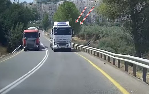 Kravas auto šoferis no Izraēlas īsteno ārkārtīgi bīstamu apdzīšanas manevru uz nepārredzama kalnu ceļa. Vēlāk viņam par šo pārkāpumu atņem tiesības.