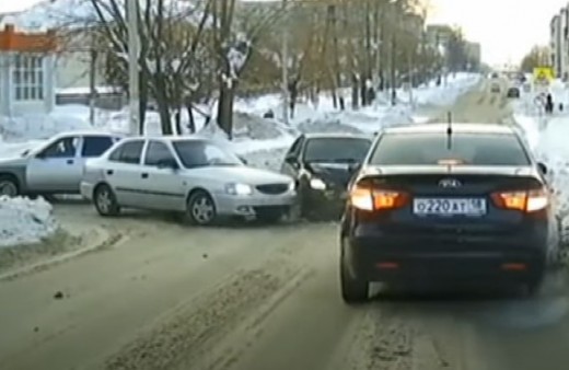 Augstie sniega vaļņi un automobilis, kas veic pagriezienu un piestāj šaurās ielas dēļ aizsedzot skatu, "piespiež" izbraucošā auto vadītāju kļūdīties.