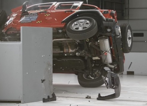 Četrdurvju Jeep Wrangler IIHS testos izgāzies arī šoreiz. Pareizāk gan būtu teikt „apgāzies”, jo tieši tā noticis pārbaudē, kur automašīnai jātiekas ar frontālu šķērsli. Triecienā ar nelielu pārklājumu Jeep apgāzās un, lai gan drošības karkass izturēja un drošības sistēmas nostrādāja, Wrangler tika novērtēts ar zemu atzīmi.
