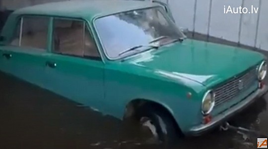 Applūdušās pazemes autostāvvietas tiek atbrīvotas no noslīkušajiem auto, šoreiz kārta padomjlaiku žigulim.