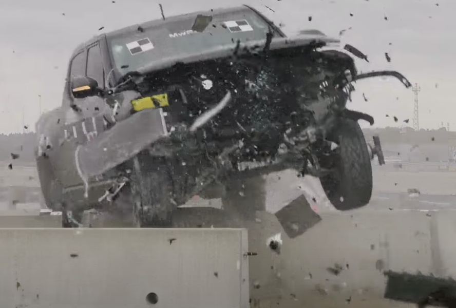 Nebraskas Universitātes Drošības centrs testiem izvēlēja četras tonnas smago Rivian R1T pikapu kas ar ātrumu 100 kilometri stundā ietriecās metāla barjerās, aiz kurām bija novietoti vairāki betona bloki.
