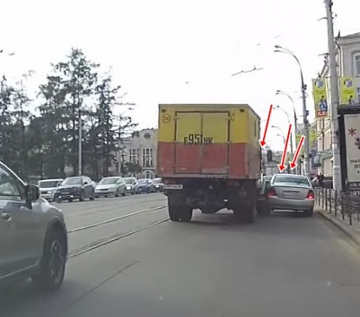 Iela, kurā bija iezīmētas divas joslas, aiz krustojuma izmainās un diviem transportiem tajā kļūst par šauru.