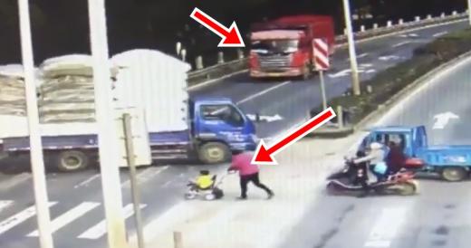 Video no Ķīnas - trīsgadīgs bērns brīnumainā kārtā guvis vien vieglas traumas sadursmē ar kravas auto, kura šoferis ignorē luksofora aizliedzošo signālu.
