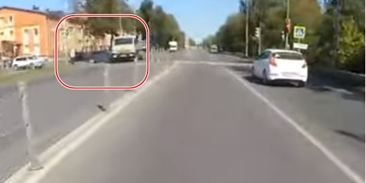 Autovadītāja ar BMW sāk startēt pirms vēl KAMAZ izbraucis no krustojuma, kā rezultātā pazaudē savu "degunu".