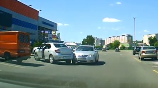 Avārija lielveikala stāvvietā. Neraugoties uz to, ka abi automobiļi pārvietojas nelielā ātrumā, sadursme tomēr notiek.