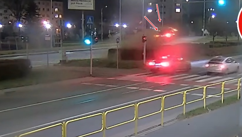 Komentārā teikts, ka Škoda vadītājs saduras ar priekšā braucošo Audi, novirzās no kursa un uzbraucot zaļajai zonai, kas nostrādā kā tramplīns, pārlido apstādījumam un nonāk uz ielas, kur kustība virzās uz pretējo pusi.